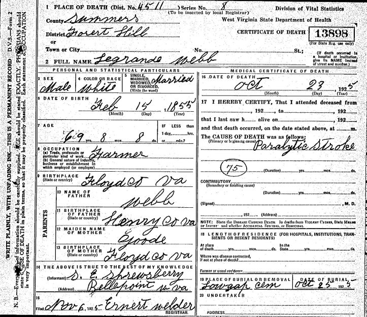 Then sadly, on December 4, 1898, at the age of 43, Legrande lost his wife Mary Jane in Hinton, Summers County, West Virginia. Shortly after, in 1899 at the age of 44, Legrande married his third wife, Clarah Adaline Bailey (b. 1882 – d. 1938). A later marriage certificate of their son, Tilden Webb, lists his name as “Lee Grant Webb”…