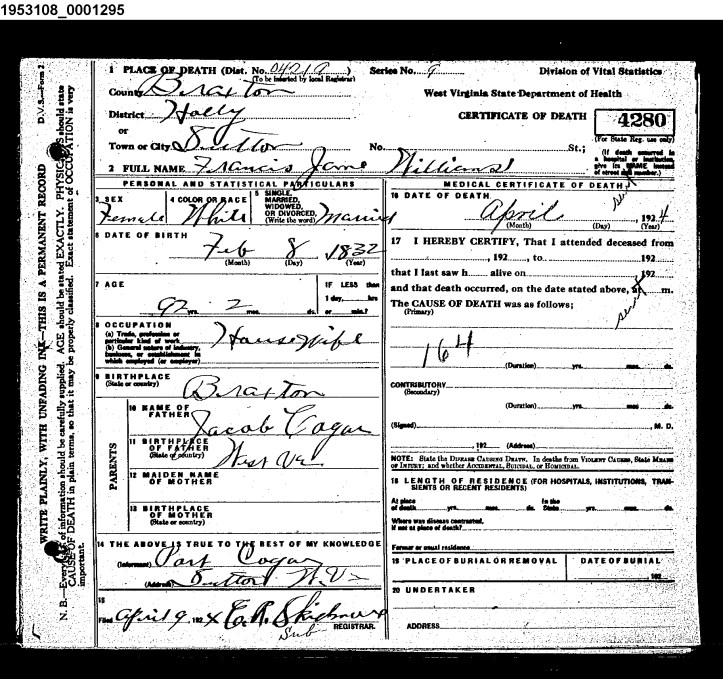 Francina herself passed away on April 8, 1924. This is recorded in the Braxton County Records.