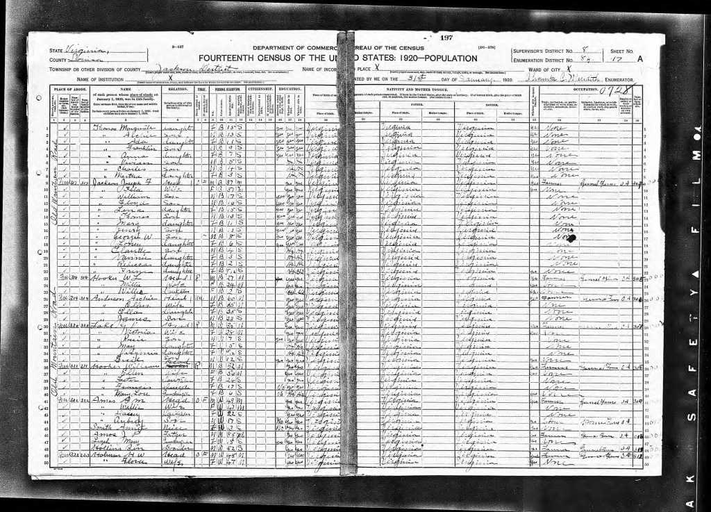 Sara Mae, age 5, appears on the 1920 Census with her family in Jackson, Louisa, Va; it is noted that she can’t yet write: