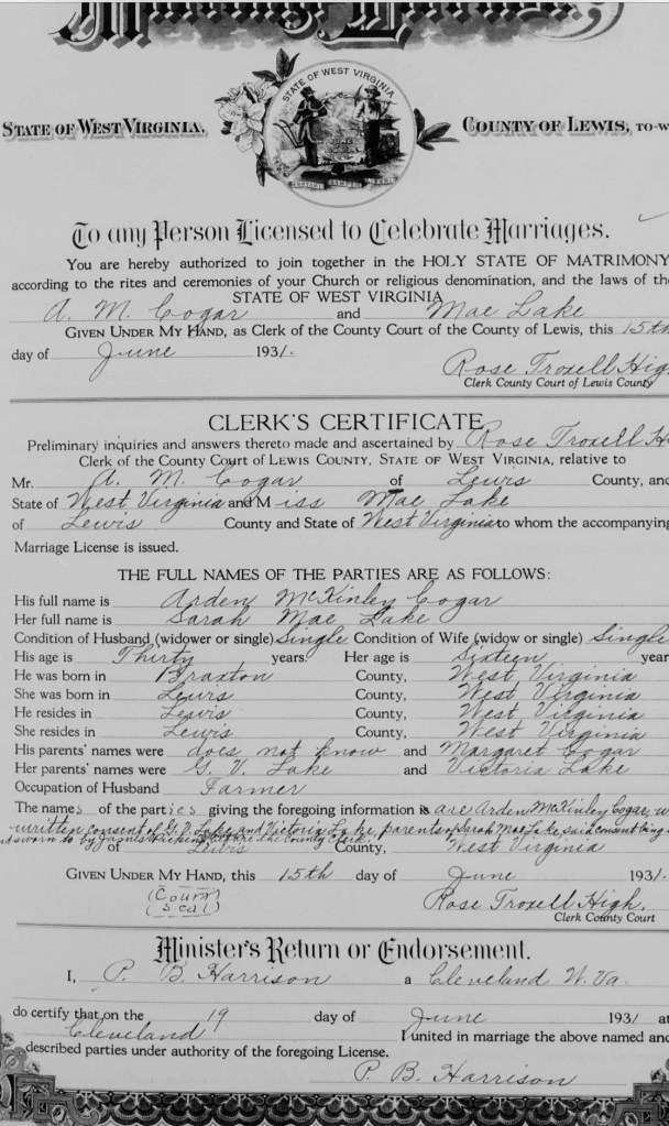 In 1931, at age 16, Sara married Arden McKinley Cogar (b. 1900).