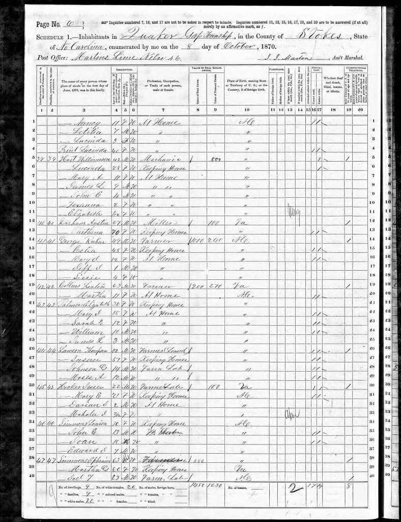 She’s at home on the 1870 Census. The family is now at Quaker Gap, Stokes County, North Carolina.