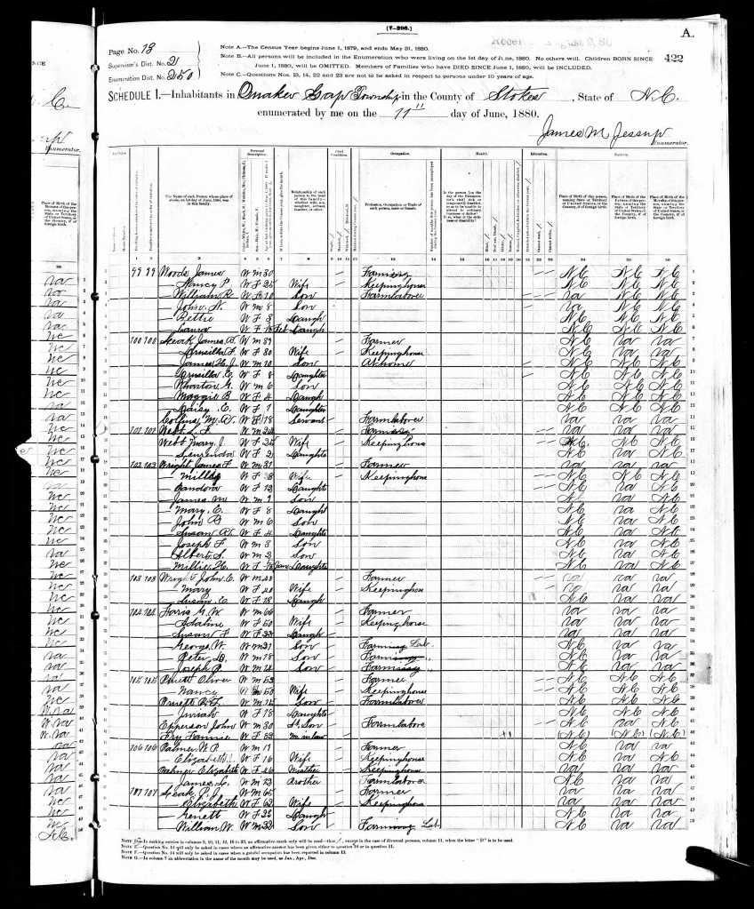 On the 1880 Census, she is “Keeping House” with LeGrand in Quaker Gap, Stokes Co, North Carolina.